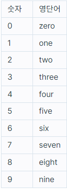 참고로 각 숫자에 대응되는 영단어는 다음 표와 같습니다.